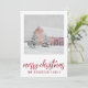 Simple grange rouge dans la carte de Noël de vacances de neige hivernale. Ajoutez votre nom de famille. Style de campagne.