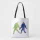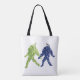 Grape Friends tote bag. A pair of grape bunches, one green and one purple, walk companionably hand-in-hand. The stem of the green bunch seems to be looking at the purple bunch. The purple grape stem eagerly returns the glance.