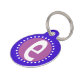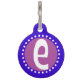 This round pet tag features a graphic lowercase letter E on a royal blue and lilac background, surrounded by a circle of white dots. Fully customizable! Add your dog's personal info on back, or delete if you prefer.
