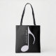 Graphic musical note on black tote bag personalized with your name... and on back side: a pattern of white music notes