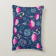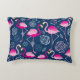 Graphic pattern of pink flamingos on a dark blue b accent pillow