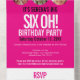 Bold simple graphic bright hot pink, black and white photo template all-in-one 60th birthday invitation. Personalize this detachable milestone birthday invitation with your own birthday party event details, and up to four different photos of your birthday girl. Invite comes with a simple RSVP detachable reply card where you can also request a song to dance to or ask for any dietary or special requirements if required. Simple three photo circles for your now and then photos and space for your own photo in the 0 of 60 on the outside flap that is up to 4 different photos for you to add. Other colours and matching items are available. © Original design by Sarah Trett for www.mylittleeden.com on Zazzle.