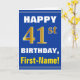 Ce simple design de carte de voeux sur le thème de l'anniversaire présente un voeu d'anniversaire chaleureux comme "HAPPY 41st BIRTHDAY, First-Name!" sur le devant, en texte gras sur un arrière - plan de couleur bleue. Le numéro d'anniversaire a une apparence de coloration fausse/imitation or. Le nom sur le devant peut être personnalisé. L'intérieur comporte un message d'anniversaire qui peut être customisé. Une carte de voeux comme celle-ci pourrait être une façon amusante d'offrir des voeux d'anniversaire à quelqu'un qui célèbre son quarante et unième anniversaire. [~Z0000278]