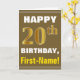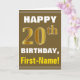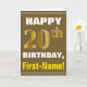 Ce simple design de carte de voeux sur le thème de l'anniversaire présente un voeu d'anniversaire chaleureux comme "HAPPY 20th BIRTHDAY, First-Name!" sur le devant, en texte gras sur un arrière - plan de couleur marron. Le numéro d'anniversaire a un look de couleur imitation or. Le nom sur le devant peut être personnalisé. L'intérieur comporte un message d'anniversaire qui peut être customisé. Une carte de voeux comme celle-ci pourrait être une façon amusante d'offrir des voeux d'anniversaire à quelqu'un qui célèbre son vingtième anniversaire. [~Z0000281]