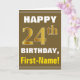 Ce simple design de carte de voeux sur le thème de l'anniversaire présente un voeu d'anniversaire chaleureux comme "HEUREUX 24ème anniversaire, prénom!" sur le devant, en texte gras sur un arrière - plan de couleur marron. Le numéro d'anniversaire a une apparence de coloration fausse/imitation or. Le nom sur le devant peut être customisé. L'intérieur comporte un message d'anniversaire qui peut être customisé. Une carte de voeux comme celle-ci pourrait être une façon amusante d'offrir des voeux d'anniversaire à quelqu'un qui célèbre son vingt-quatrième anniversaire. [~Z0000281]