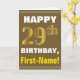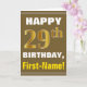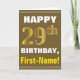 Ce simple design de carte de voeux sur le thème de l'anniversaire présente un voeu d'anniversaire chaleureux comme "HEUREUX 29e anniversaire, prénom!" sur le devant, en texte gras sur un arrière - plan de couleur marron. Le numéro d'anniversaire a un look de couleur imitation or. Le nom sur le devant peut être personnalisé. L'intérieur comporte un message d'anniversaire qui peut être customisé. Une carte de voeux comme celle-ci pourrait être une façon amusante d'offrir des voeux d'anniversaire à quelqu'un qui célèbre son vingt-neuvième anniversaire. [~Z0000281]