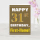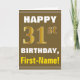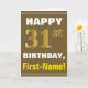 Ce simple design de carte de voeux sur le thème de l'anniversaire présente un voeu d'anniversaire chaleureux comme "HAPPY 31st BIRTHDAY, First-Name!" sur le devant, en texte gras sur un arrière - plan de couleur marron. Le numéro d'anniversaire a une apparence de coloration fausse/imitation or. Le nom sur le devant peut être personnalisé. L'intérieur comporte un message d'anniversaire qui peut être personnalisé. Une carte de voeux comme celle-ci pourrait être une façon amusante d'offrir des voeux d'anniversaire à quelqu'un qui célèbre son trente et unième anniversaire. [~Z0000281]