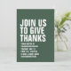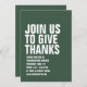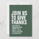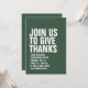 Avec une typographie blanche audacieuse, cette invitation à dîner Thanksgiving vert est facilement customisée et donne le ton pour une fête amusante et décontractée de dinde