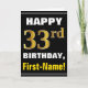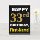 Ce simple design de carte de voeux sur le thème de l'anniversaire présente un voeu d'anniversaire chaleureux comme "HAPPY 33rd BIRTHDAY, First-Name!" sur le devant, en texte gras sur un arrière - plan de couleur noire. Le numéro d'anniversaire a un look de couleur imitation or. Le nom sur le devant peut être customisé. L'intérieur comporte un message d'anniversaire qui peut être personnalisé. Une carte de voeux comme celle-ci pourrait être une façon amusante d'offrir des voeux d'anniversaire à quelqu'un qui célèbre son trente-troisième anniversaire. [~Z0000275]