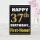 Ce simple design de carte de voeux sur le thème de l'anniversaire présente un voeu d'anniversaire chaleureux comme "HAPPY 37th BIRTHDAY, First-Name!" sur le devant, en texte gras sur un arrière - plan de couleur noire. Le numéro d'anniversaire a une apparence de coloration fausse/imitation or. Le nom sur le devant peut être personnalisé. L'intérieur comporte un message d'anniversaire personnalisable. Une carte de voeux comme celle-ci pourrait être une façon amusante d'offrir des voeux d'anniversaire à quelqu'un qui célèbre son trente-septième anniversaire. [~Z0000275]