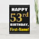 Ce simple design de carte de voeux sur le thème de l'anniversaire présente un voeu d'anniversaire chaleureux comme "HAPPY 53rd BIRTHDAY, First-Name!" sur le devant, en texte gras sur un arrière - plan de couleur noire. Le numéro d'anniversaire a une apparence de coloration fausse/imitation or. Le nom sur le devant peut être customisé. L'intérieur comporte un message d'anniversaire qui peut être personnalisé. Une carte de voeux comme celle-ci pourrait être une façon amusante d'offrir des voeux d'anniversaire à quelqu'un qui célèbre son cinquante-troisième anniversaire. [~Z0000275]