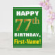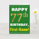 Ce simple design de carte de voeux sur le thème de l'anniversaire présente un voeu d'anniversaire chaleureux comme "HAPPY 77th BIRTHDAY, First-Name!" sur le devant, en texte gras sur un arrière - plan de couleur verte. Le numéro d'anniversaire a une apparence de coloration fausse/imitation or. Le nom sur le devant peut être personnalisé. L'intérieur comporte un message d'anniversaire qui peut être customisé. Une carte de voeux comme celle-ci pourrait être une façon amusante d'offrir des voeux d'anniversaire à quelqu'un qui célèbre son soixante-dix-septième anniversaire. [~Z0000279]