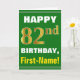 Ce simple design de carte de voeux sur le thème de l'anniversaire présente un voeu d'anniversaire chaleureux comme "HAPPY 82nd BIRTHDAY, First-Name!" sur le devant, en texte gras sur un arrière - plan de couleur verte. Le numéro d'anniversaire a une apparence de coloration fausse/imitation or. Le nom sur le devant peut être customisé. L'intérieur comporte un message d'anniversaire qui peut être personnalisé. Une carte de voeux comme celle-ci pourrait être une façon amusante d'offrir des voeux d'anniversaire à quelqu'un qui célèbre son quatre-vingt-deuxième anniversaire. [~Z0000279]