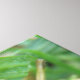 This awesome canvas print features a detailed macro photograph of a small green grasshopper with brown mottled markings sitting on the grass. In the photograph you can see the detail of the jointed legs, long antennae and black and gold eyes of the grasshopper.