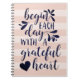 Spread an attitude of gratitude. Our handwritten typography notebook design features the quote "begin each day with a grateful heart" in hand lettered calligraphy script adorned with swashes and a heart illustration, on a tone on tone blush pink striped background.