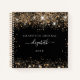 A stylish black background with faux gold glitter dust. Add a year, your name, and a title. The name is written with a modern hand lettered style script.