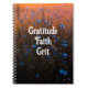 Gratitude, Faith, Grit notebook. High-resolution photo of blue wildflowers and white text overlay.