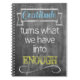 Chalkboard gratitude journal with the saying "Gratitude turns what we have into enough" written on the cover in pastel coloured chalk.