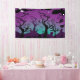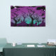 Graveyard black, purple, turquoise Halloween banner, featuring a cemetery with spooky trees, graves, crosses, skulls, a witch, an owl, bats, a ghost, a black cat, clouds and the crescent moon over it on purple and turquoise background.