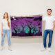 Graveyard black, purple, turquoise Halloween flexible throw blanket, featuring a cemetery with spooky trees, graves, crosses, skulls, a witch, an owl, bats, a ghost, a black cat, clouds and the crescent moon over it on purple and turquoise background.
