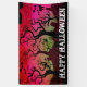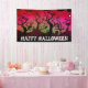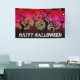 Graveyard black, red, olive green Halloween banner, featuring a cemetery with spooky trees, graves, crosses, skulls, a witch, an owl, bats, a black cat, clouds and the text "Happy Halloween" on red and olive green background.