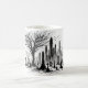 A stark black and white illustration depicting a haunting contrast between nature and human civilization. A sprawling graveyard, filled with weathered tombstones and crosses, is juxtaposed with a towering, ominous cityscape in the background. The city's skyscrapers pierce the sky like skeletal fingers, casting long, ominous shadows over the graves. Bare trees, their branches twisted and gnarled, stand sentinel over the cemetery, creating a sense of isolation and decay. The image evokes a sense of the human encroachment on nature, the passage of time, and the inevitability of death.