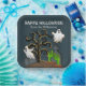 These spooky and cute Halloween party plates feature a graveyard scene. An image of a graveyard at night is printed along the bottom with two flying ghosts and a zombie trying to climb out of his grave. You can see his yucky green arms coming out of the ground. A sinister looking tree is pictured in the background. The image is accented with faux gold glitter.