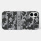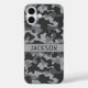 Customize this gray camouflage iPhone 16 plus case with your name in a trendy modern CAP font in dark gray on light gray. It's masculine and perfect for your favorite military, hunting, country or outdoorsman!