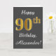 This simple birthday card design features the message "Happy 90th Birthday", with the "90th" having a faux gold-like appearance. It also features a personalized name, and a gray background. It could be given to somebody who is celebrating their ninetieth birthday.