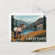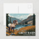 Striking vintage-style travel poster illustration featuring a Bighorn Sheep standing by an alpine lake, with rugged mountains and snow-capped peaks in the background, labeled "Great Basin National Park." Captures the high-desert and mountain wilderness of the Nevada park. Excellent for wildlife lovers, hikers, Nevada visitors, and collectors of WPA-style national park posters.