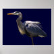 This fine art photography poster features the Great Blue Heron, a large wading bird in the heron family Ardeidae, common near the shores of open water and in wetlands. He is the largest North American heron. Notable features include slaty flight feathers, red-brown thighs, and a paired red-brown and black stripe up the flanks; the neck is rusty-grey, with black and white streaking down the front; the head is paler, with a nearly white face, and a pair of black plumes running from just above the eye to the back of the head. The feathers on the lower neck are long and plume-like. Because this is the breeding season, he also has plumes on the lower back and an orange bill. His feathers are backlit by the luminous sunlight.