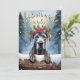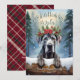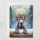 This adorable holiday greeting card features a cute Great Dane Dog illustration wearing a festive crown wreath of winter florals, holly, pine, and berries, with snowflakes gently falling against a Snowing Rustic Pine Tree Forest Scene. The Great Dane is peeking over the snow-capped log to say hello! The playful text "Joyful Holiday Wishes" adds a warm seasonal greeting, and can be customized as you like. The reverse side is decorated with a classic plaid check, adding a traditional touch to the overall design. This cute, playful card is perfect for sending holiday cheer to family and friends, and the customizable name and date make it a personalized keepsake.