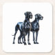 A stylized illustration of two majestic Great Danes standing side by side, showcasing their sleek, muscular bodies and elegant features. The dogs are black with smooth, glossy coats, accentuated by dramatic shadows and highlights to emphasize their strong physiques with a subtle watercolor effect adding an artistic touch.