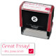 This inspirational rubber stamp design features the message "Great Essay!" and a custom teacher name. It also features a decorative check mark. It could be used by a teacher or educator when grading student work, to acknowledge that a student has done an exceptional job.