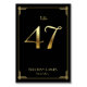 Great Gatsby Art Deco wedding table number cards with golden number 47 and changeable text, where you can add your names and wedding date, printed on black background