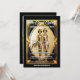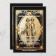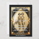 An ornate faux gold vintage art deco style frame has a golden oval inlay on which white templates for your personalized wording appear. Flapper girls with short brown hair are wearing long figure hugging faux gold foil satin dresses and caps that appear to shimmer and shine with radiance. They are framed by an elegant and intricate art nouveau retro style frame reminiscent of the twenties era. The design is suited to 1920's theme parties; art deco themed celebrations or Great Gatsby bridal party and corporate events. They are perfect for both business and personal use. The back has the same graphic with a template for your heading or additional information.