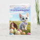 Happy Easter card for a great-granddaughter featuring an adorable, sweet-eyed, fluffy white kitten beside a basket brimming with colorful eggs.