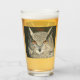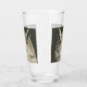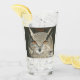 A colour pencil and pen drawing of a Great Horned Owl with piercing orange eyes adorns this customizable drinking glass!