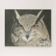 A colour pencil and pen drawing of a Great Horned Owl with piercing orange eyes adorns this intense wildlife puzzle!