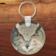 A colour pencil and ink drawing of a Great Horned Owl with piercing orange eyes adorns this keychain!