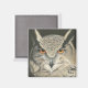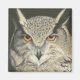 A colour pencil and pen drawing of a Great Horned Owl with piercing orange eyes adorns this magnet!