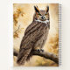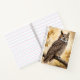 A majestic great horned owl is perched in a tree, surrounded by brown autumn leaves, on a neutral sandy background, Beautiful notebook, and perfect for anyone who loves owls, birds, nature, and the outdoors.