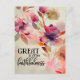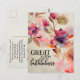 Postcard depicts a beautiful floral watercolor including elegant pink and lavender flowers and greenery on a light gold background. It features the beloved Christian Hymn, "Great is Thy Faithfulness." The back features the greeting along with the the chorus of the Hymn, "Great is Thy faithfulness! Morning by morning new mercies I see. All I have needed thy hand hath provided; Great is Thy faithfulness, Lord, unto me!" They both can be customized to the details of your choice.