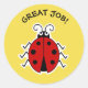 This sticker depicts a striking ladybug, and the words "GREAT JOB!" in black text on a bright yellow background - or you can edit this for your preferred message. An appealing way for a teacher or parent to show appreciation for great work or helpfulness for example.