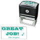 This motivating rubber stamp design features the encouraging message "GREAT JOB!" and a personalized teacher's name. It also features a decorative musical note. It could be used by a teacher or educator when grading student work, to acknowledge that a student has done an exceptional job.