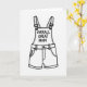 This card features a black-and-white drawing of a pair of short overalls centered on a plain white background, with thick dark outlines that give it a crisp, graphic look. The straps, small buckles, waistband, and roomy pockets are simplified, making the outfit feel like a familiar favorite that someone might wear while giving a quick, affectionate hug ❤️. Across the bib area, the message “OVERALL GREAT MOM” is written in dark, hand-drawn lettering that sits front and center, like a friendly note meant to be noticed right away. Dashed lines trace the seams and edges to suggest stitching, adding a gentle, cozy touch—like care shown in the little details 🌼. The strong contrast between the dark lines and the open white space keeps everything easy to read and lets the overalls stand out confidently. The wordplay reads like a teasing compliment, the kind you’d share with a mom who smiles back and squeezes your hand a little tighter. The layout stays vertical and balanced, with the overalls filling most of the frame and the text spanning the bib in dark ink. Small dashed stitches run along the straps, pockets, and leg openings, forming neat rows around the garment’s edges.