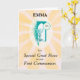 Congratulate your special great niece as she makes her First Holy Communion. This card celebrates with a golden sun burst with a chalice, host and wheat in the centre in teal colour. Customize with her name for a truly personal keepsake on this holy day.