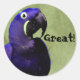 A blue hyacinth macaw encourages kids by saying "Great!"