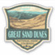 Great Sand Dunes vector artwork design. The park is in southern Colorado. It’s known for huge dunes like the towering Star Dune, and for the seasonal Medano Creek and beach created at the base of the dunes.