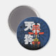 This trendy, blue and black magnet features a cartoon drawing of a Great Tengu, one of the yokai monsters from the mythology of Japan. The Great Tengu, or Daitengu, is one of the two types of tengu, and is easily recognized by its long nose and red skin. Although tengu can be vicious, this one is cute. The large kanji characters in the background say "Tengu" in Japanese.